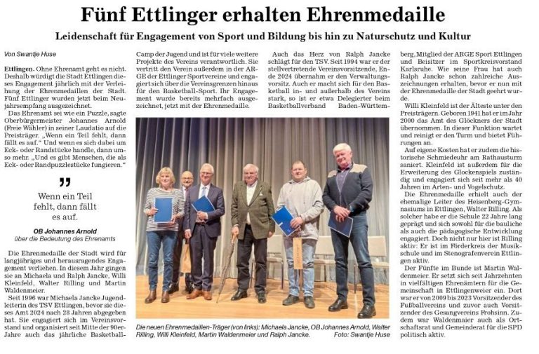 Im feierlichen Rahmen der Neujahrsfeier der Stadt Ettlingen wurde Martin Waldenmaier für sein langjähriges ehrenamtliches Engagement gewürdigt. Besonders hervorgehoben wurde seine Verdienste als 1. Vorstand des Fußballvereins Ettlingenweier, den er