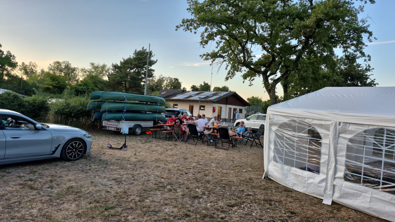 Am 18. Juli ging es los. Am Clubhaus wurde der Sprinter gepackt, wie immer mit einer Vollausstattung: Kühlschränke, Durchlaufkühler, Zelt, Pavillon, Grill und Bier. Gegen 16 Uhr waren die meisten mit PKW und Wohnwagen am Campingplatz in Neuenburg, sodass das Zelt schnell aufgebaut war und man zügig zum gemütlichen Teil übergehen konnte.