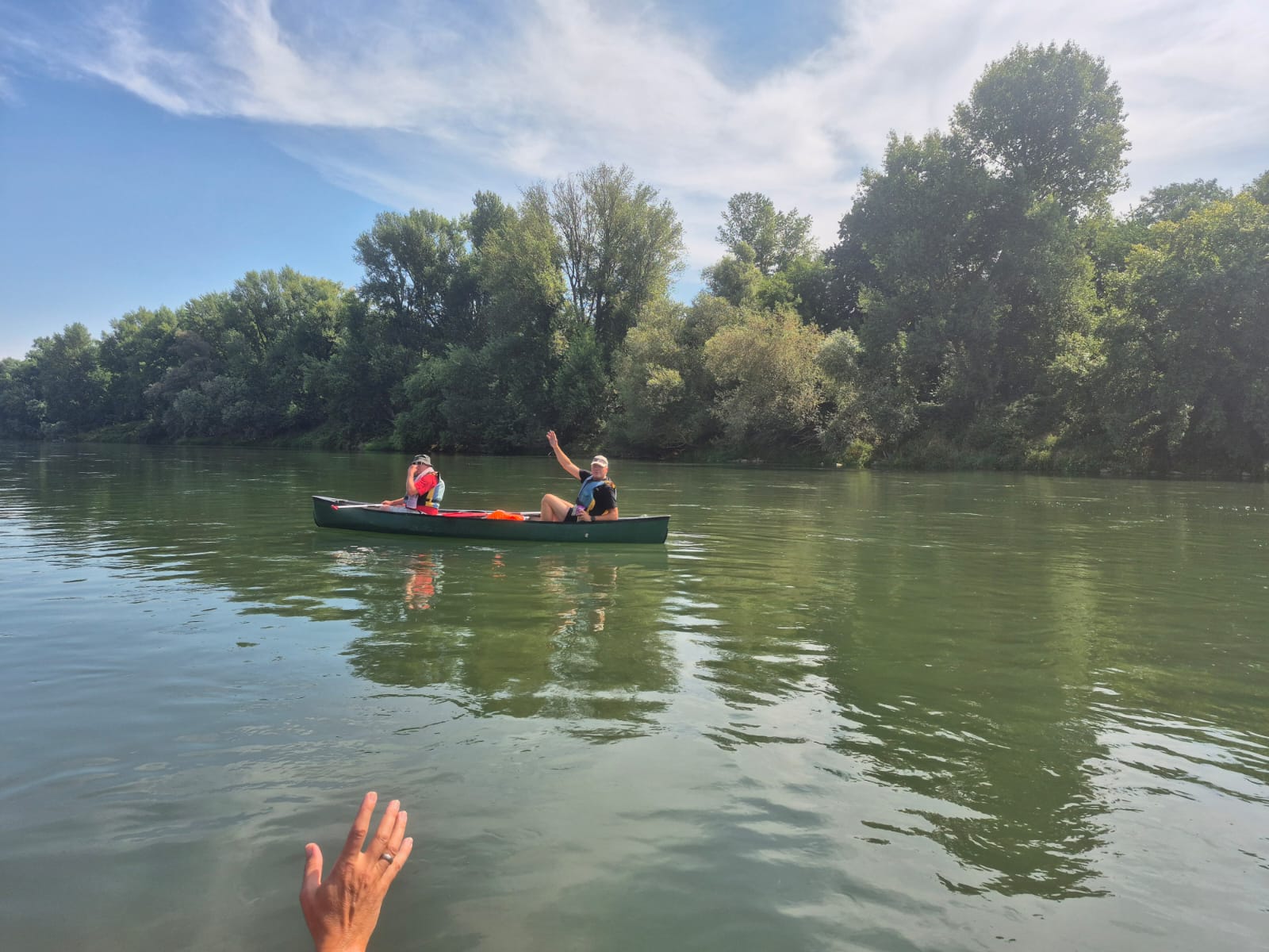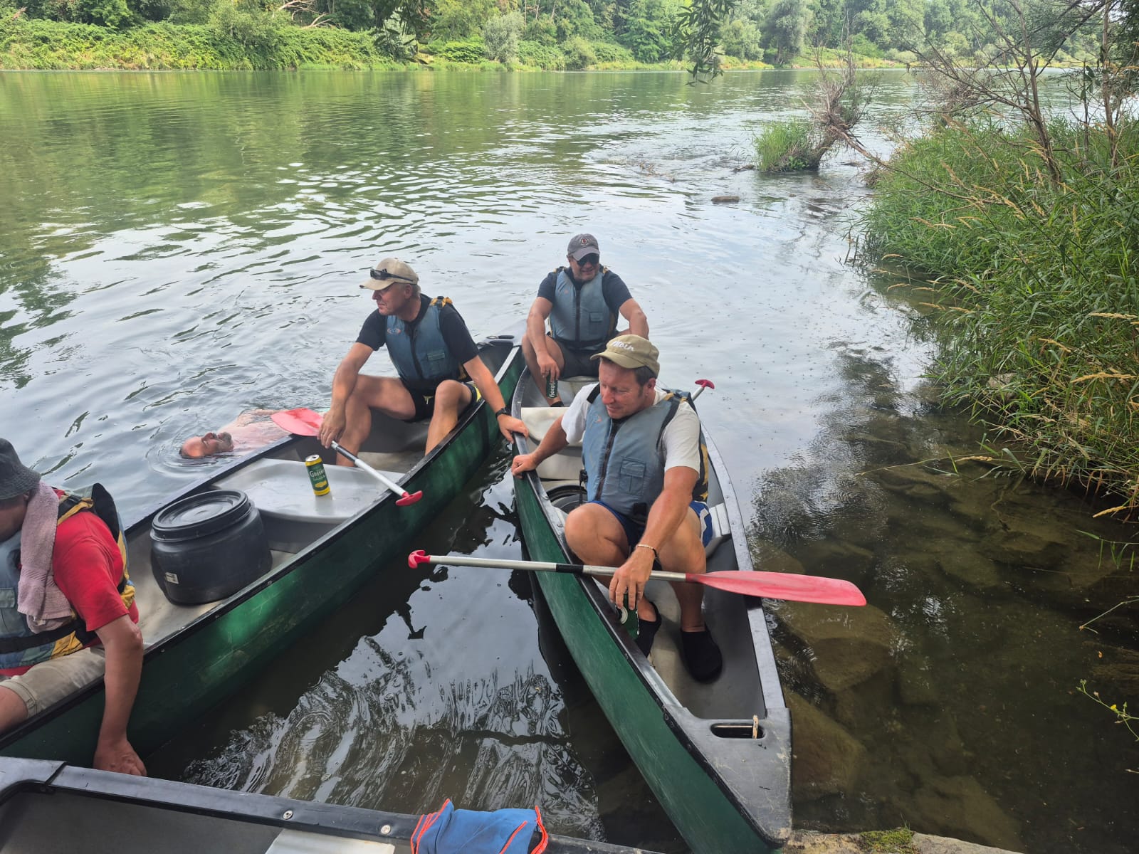 Dank Scheppl´s Beschreibung haben wir den Einstiegspunkt gut gefunden. Gerüstet mit Pils und Radler in der Tonne ging es in Zweier- und Dreierbooten auf den Altrhein, nicht zu heiß, leicht bewölkt aber angenehm warm (27 Grad).