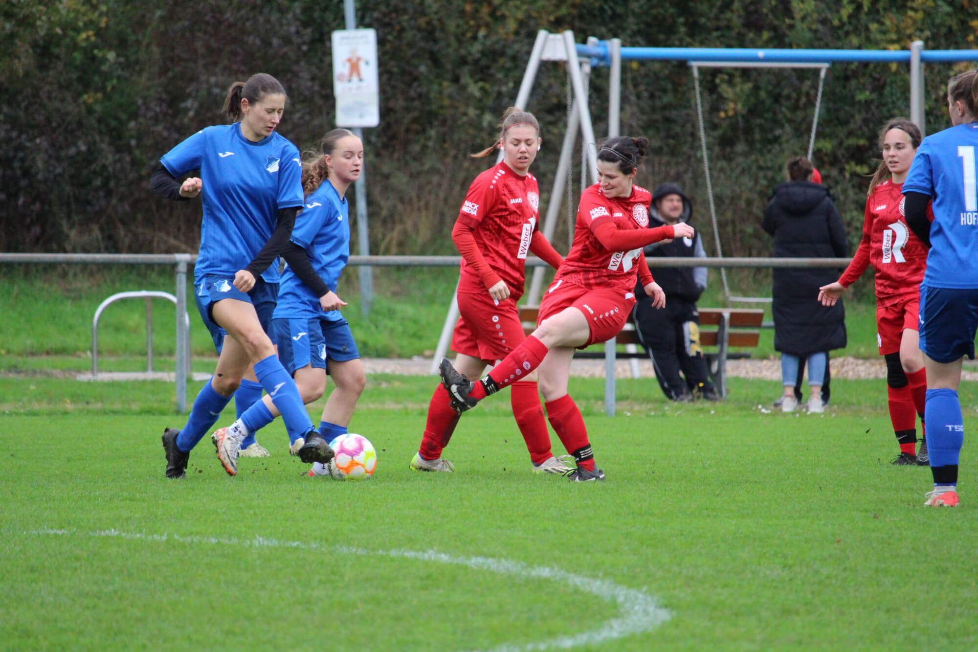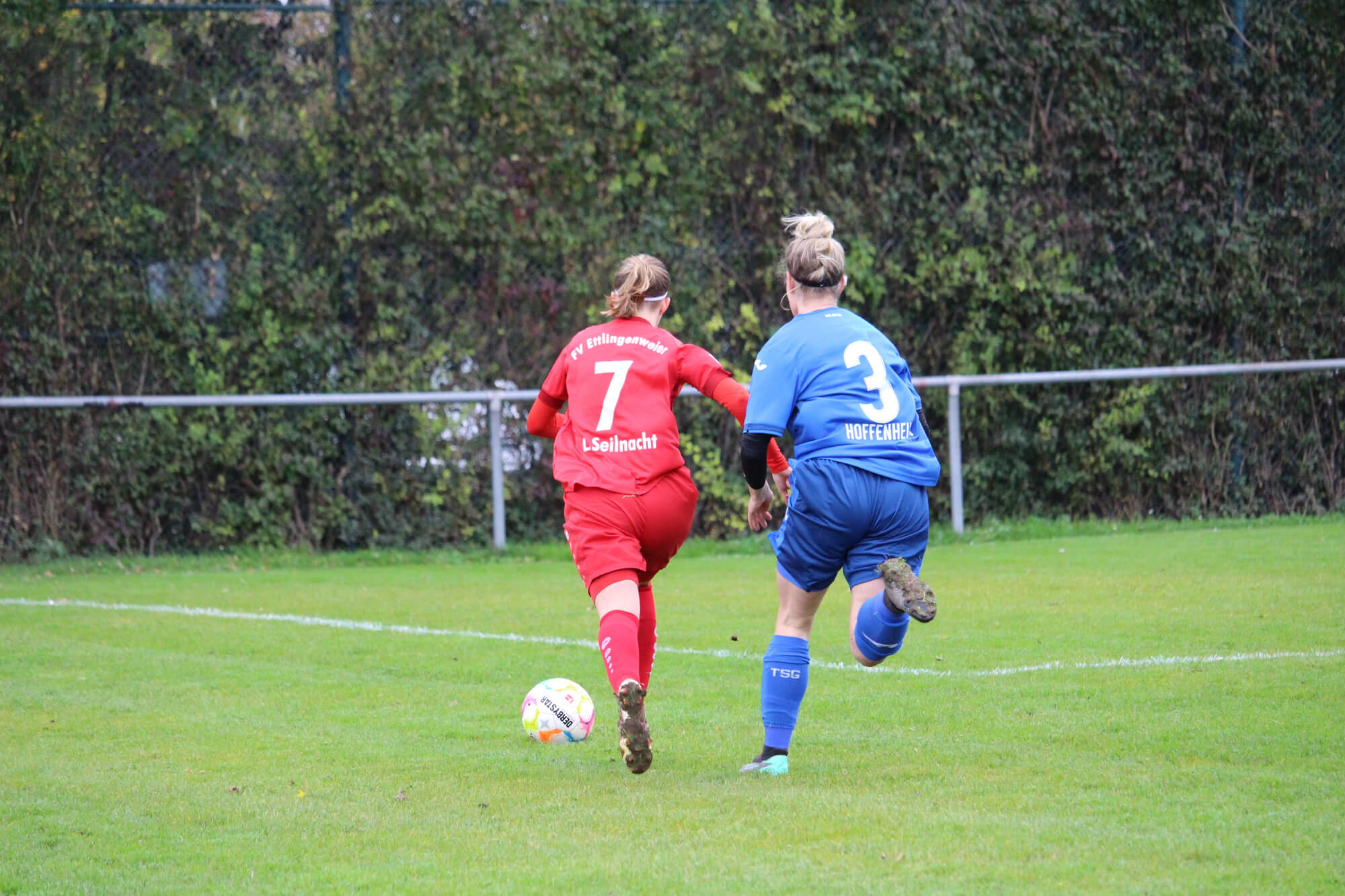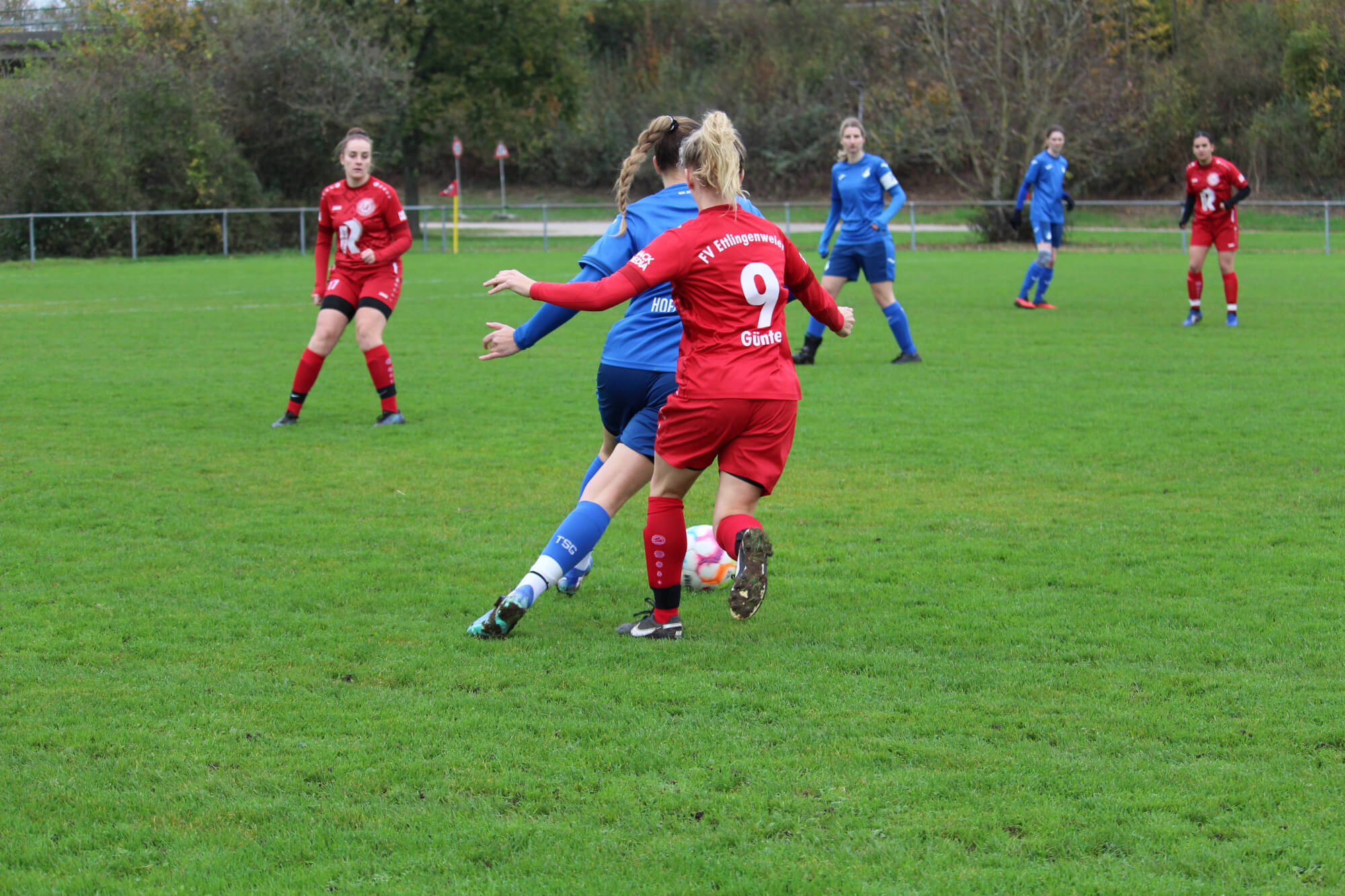 Die FVE-Damen kamen gut in das Spiel und zeigten über die volle Zeit viel Einsatz. Bereits nach 8 Spielminuten konnte Hoffenheim Nicole Günter nur per Foul im Strafraum stoppen. Den folgerichtigen Elfmeter konnte die Damen des – auch im Nachschuss – nicht im Tor unterbringen, doch der zweite Abpraller der Hoffenheimer Torfrau landete am Bein der Mitspielerin und der Ball sprang ins eigene Netz. Doch schon fünf Minuten später musste der FVE nach einer Unachtsamkeit und aus leicht verdächtiger Abseitsposition den Ausgleich hinnehmen.