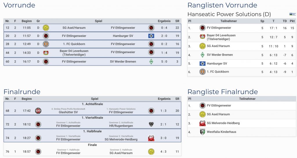 Am Samstag, den 31. Januar, ging der FVE in Gruppe D an den Start. Bereits in der Gruppenphase unterstrich das Team eindrucksvoll seine Ambitionen und gewann die Gruppe souverän ohne Punktverlust. Mit fünf Siegen, 15 Punkten und einem Torverhältnis von 17:1 ließ die Ü32 der Konkurrenz keine Chance. Unter anderem gelangen deutliche Erfolge gegen den Gastgeber Hamburger SV, den SV Werder Bremen, sowie gegen den Vorjahressieger Bayer 04 Leverkusen.